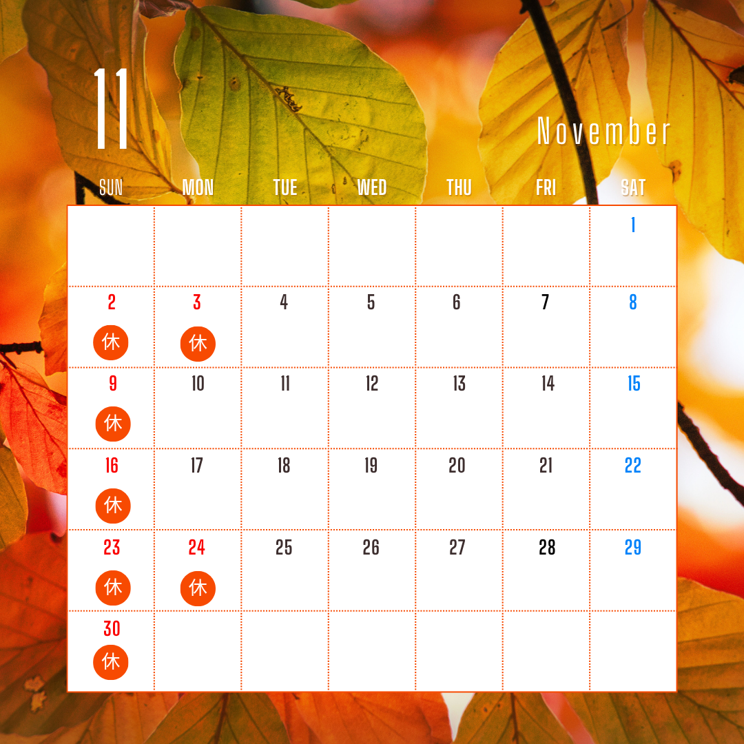 とは言え朝・日中・夜の気温差がありすぎる!!服装にもバランスも難しい(汗)でも気づけば今年も後2か月で終わりなると思うとまだまだ寒さが足りないな…(>_<)これからもっと寒くなるのでしょうか?寒くならないと困る!海苔にとっては寒さも大事ですからね。さて11月のお休みのご案内です。11月は祝日の関係で通常より休みが少し多くなります。ネットショップに関しましても発送にずれが生じることがありますので、お早めにご注文をお願い致します。